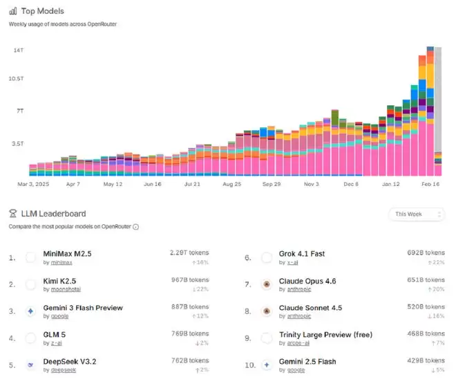 值得注意的是,Anthropic提出相关指控的时机,正值美国讨论放松对华AI芯片出口和中国模型在海外热度攀升之际。MiniMax M2.5和Kimi K2.5近期都一度成为大模型调用平台OpenRouter上使用量最大的模型,并在海外开发者群体中获得了高性价比、能力出色的良好口碑,而DeepSeek尚未发布的V4,则吊足了全球网友的胃口。