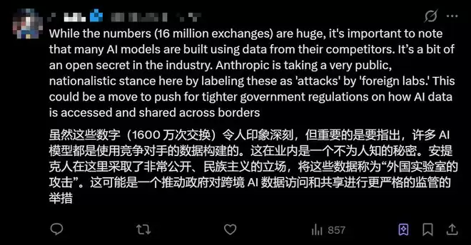 有人则质疑起了Anthropic的动机。下图中的这位网友分析道,许多AI模型都是使用竞争对手的数据构建的,这在业内是一个公开的秘密。而Anthropic在此时采用了一个非常民族主义的立场,把这些行为贴标签,称之为“外国实验室”的“攻击”,意图可能是推动美国政府对跨境AI数据访问和共享,进行更严格的监管措施。