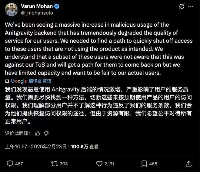 执行此次封禁的 Varun Mohan 此前带着自己的团队并入谷歌 DeepMind,一手搭起了今天的 Antigravity 平台。