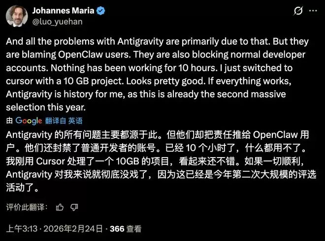部分用户发现自己不仅被踢出了谷歌 AI IDE Antigravity,连带着绑定的 Gmail 等核心服务也一并被锁。
