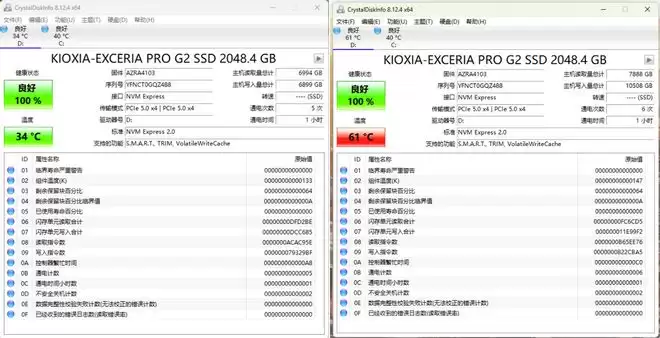 我们知道,PCIe 5.0 SSD的温度变化也会极大程度地影响SSD的传输性能,在这里我们也进行了测试。在安装了主板自带的散热片情况下,通过CDI软件识别到硬盘待机温度34℃,在多项密集写入测试中,温度也在61℃左右。