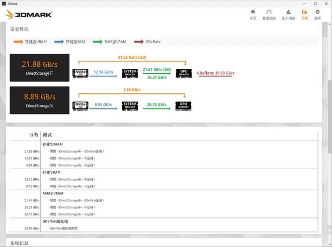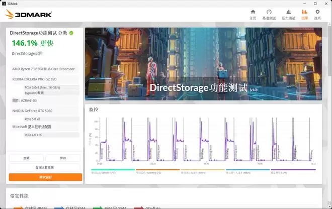 因为VE10支持DirectStorage技术,在这里我们也进行了 3DMARK DirectStorage feature test测试。在DirectStorage打开的情况下,游戏从VE10启动的速度高达12.16GB/s,在游戏启动时能够快速加载,并且在游戏中快速存档。