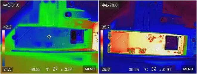 △不带标签时,左为待机温度,右为持续写入测试中瞬时温度表现