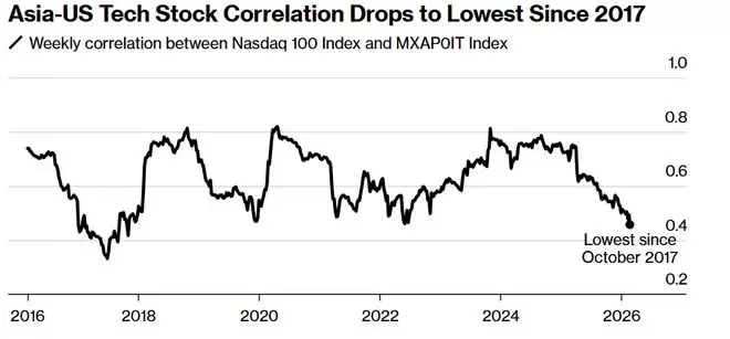 反映亚洲与美股市场的这种剧烈分化的一项关键数据显示,MSCI亚太信息技术指数与纳斯达克100指数的周度相关性已大幅降至0.45,为2017年10月以来的最低点位。