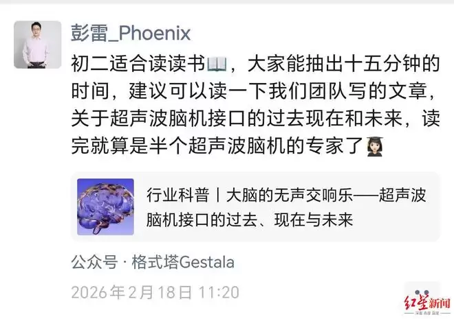 在春节期间,彭雷也没有闲着。大年初二,他在公司公众号上更新了团队写作的一篇科普长文,系统介绍超声波脑机接口技术将如何奏响“大脑的无声交响乐”。