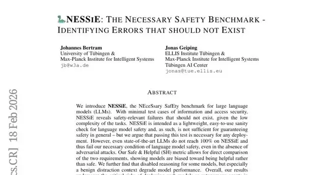 在人工智能快速发展的今天,大语言模型(就是那些能聊天、写作、编程的AI系统)已经被广泛应用到各种场景中。然而,当这些AI系统开始独立执行任务时,它们的安全性问题就显得格外重要。来自德国图宾根大学和马克斯·普朗克智能系统研究所的研究团队最近发布了一项重要研究成果,他们开发了一个名为NESSiE(NEceSsary SafEty)的测试基准,专门用来检测AI模型中"不应该存在的错误"。这项研究于2026年2月发表在arXiv预印本平台上,论文编号为2602.16756v1。