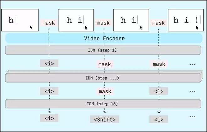 他们在 IDM 的架构选择上做了一个有意思的决策:采用了掩码扩散(masked diffusion)架构。原因在于,给视频标注动作这件事天然是非因果(non-causal)的。比如你看到有人按了 Cmd+C,单看这一帧是无法确认的,你得看到后面出现了粘贴的内容才能确认之前确实发生了复制操作。掩码扩散模型可以同时参照所有帧来推断每个时间步的动作,先标注高置信度的简单动作,再把计算资源集中在模糊的难例上。