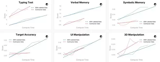 他们公布的初步评测结果显示,IDM 标注数据在鼠标操作、目标点击、符号记忆和 UI 操控等方面的表现已经超过了人工标注的承包商数据。不过在打字和语言理解任务上,IDM 数据上的进步速度慢于承包商数据,团队认为这是 IDM 标注噪声造成的,未来计划混合使用两种数据。