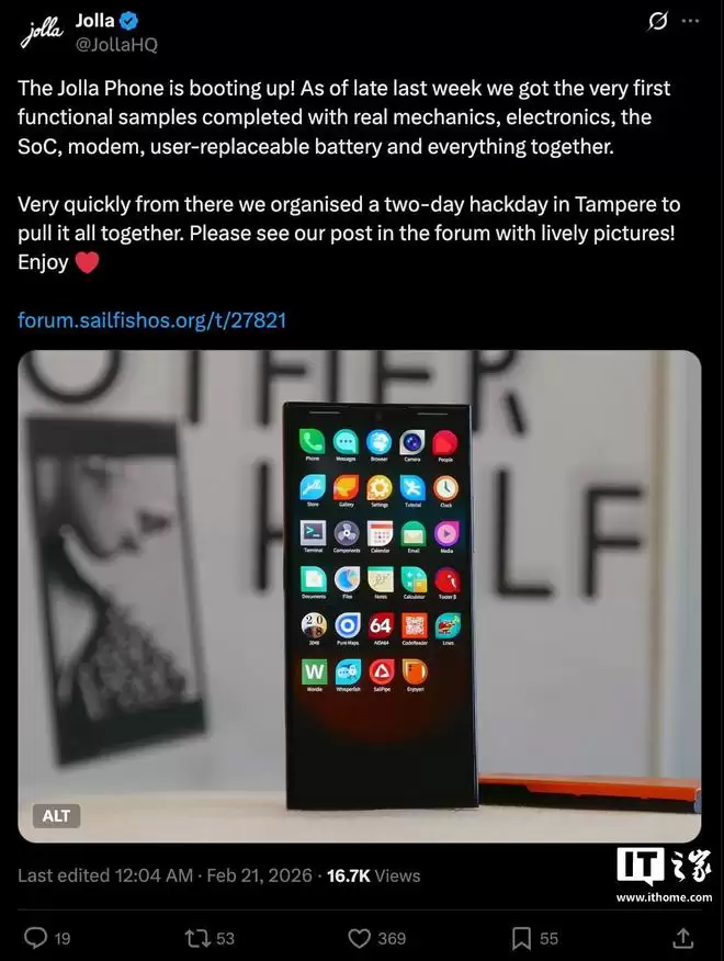 IT之家2月24日消息,Jolla公司近日正式展示了旗下全新Jolla Phone工程样机,透露该机硬件设计已基本定型,目前可正常开机运行旗鱼系统,首批产品预计今年上半年正式交付用户。