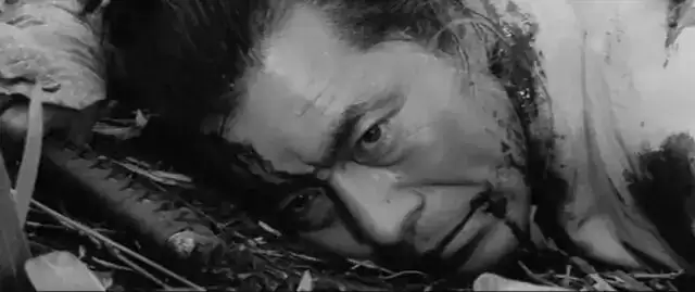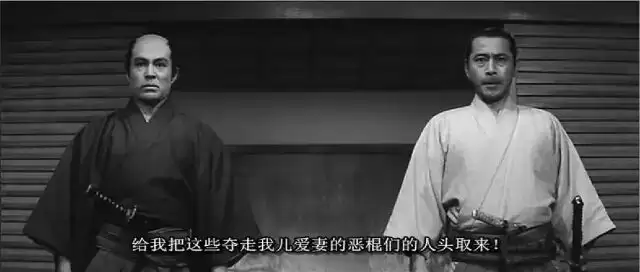 接下来我们看到了笹原一家。在片头,我们看到了主人家伊三郎(三船敏郎饰)和他最好的朋友(仲代达矢 饰)。更准确地说,我们看到了他的剑,先是看到剑尖,然后是剑刃,再是焦点转移,显示出他那剑后凶狠的眼睛,然后又一次转移到剑刃上。