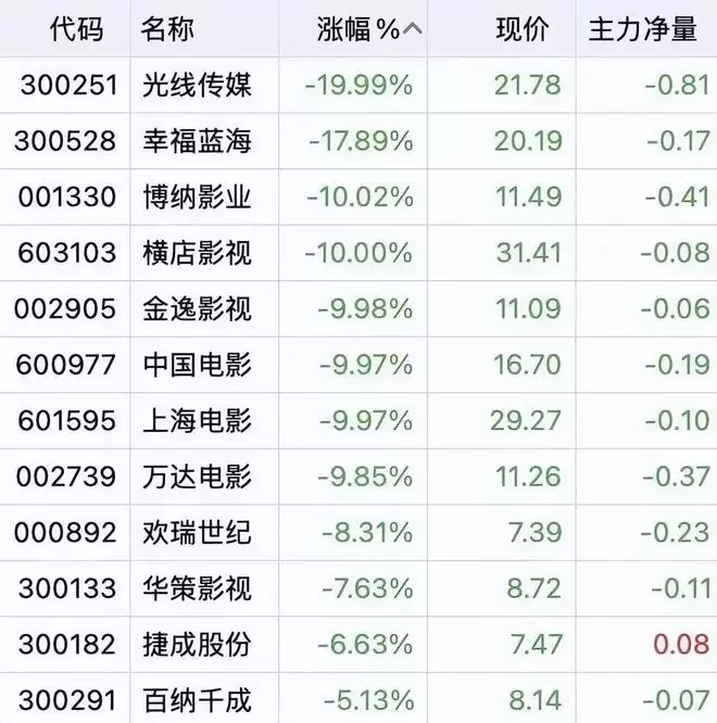票房不及预期,导致档期前集体飘红的影视股,迎来了“全线飘绿”。2月24日早盘,光线传媒、中国电影、金逸影视、横店影视、博纳影业跌停,幸福蓝海跌超15%,万达电影、上海电影、欢瑞世纪等跟跌。港股方面,猫眼娱乐、欢喜传媒、IMAX中国等多个电影概念股跌幅明显。