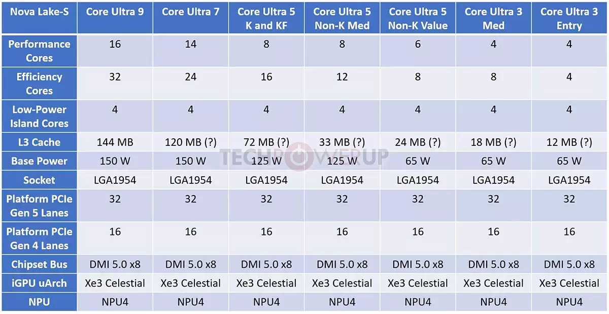 主流级别的酷睿Ultra 5和入门级的酷睿Ultra 3则将采用单计算模块。酷睿Ultra 5的产品线最为丰富:K系列旗舰规格与当前的酷睿Ultra 9相当,拥有8性能核+16能效核+4低功耗能效核;中端非K版本则具备8性能核+12能效核+4低功耗能效核,规格对标当下的酷睿Ultra 7,其TDP与K系列同为125W;入门级型号则缩减至6性能核+8能效核+4低功耗能效核,据称采用更小的计算模块,TDP降至65W。值得注意的是,部分酷睿Ultra 5型号将配备大容量的bLLC(次末级缓存)设计,以提升性能。