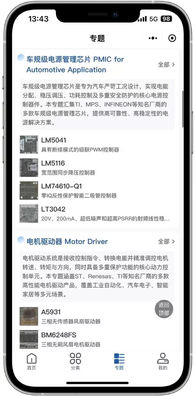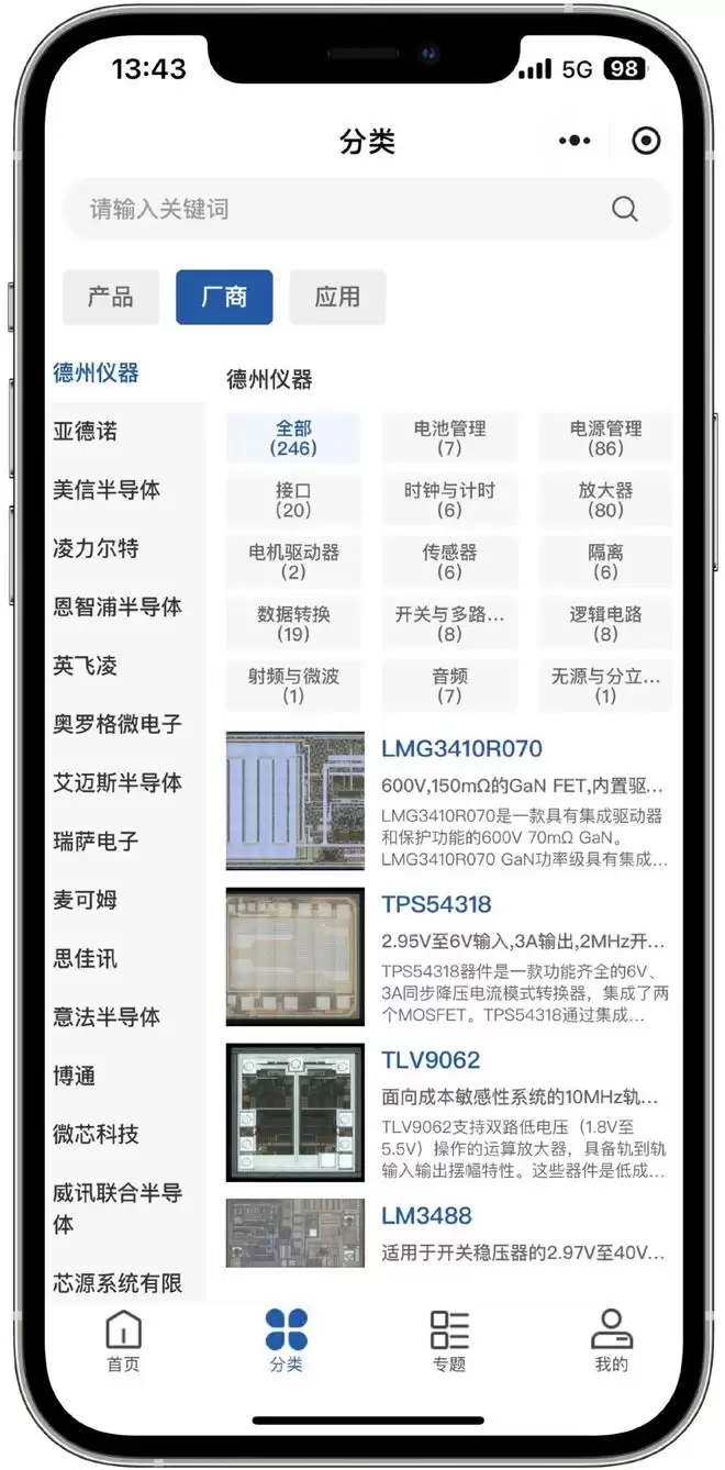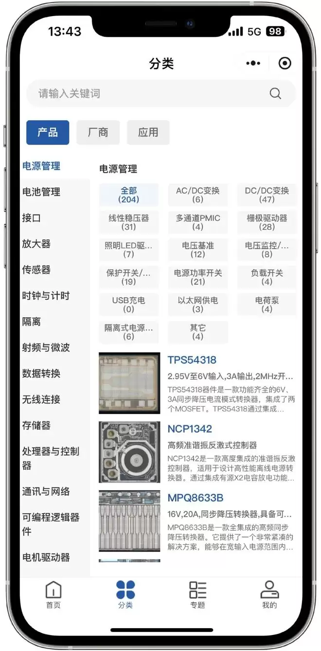 在“产品分类”中,您可以按芯片类型(如电源管理、射频、传感器等)快速筛选相关报告;“厂商分类”汇集了行业头部厂商产品的资讯报告;“应用分类”则覆盖消费电子、汽车电子、工业控制、人工智能等核心场景,助力您聚焦特定领域的技术动态。