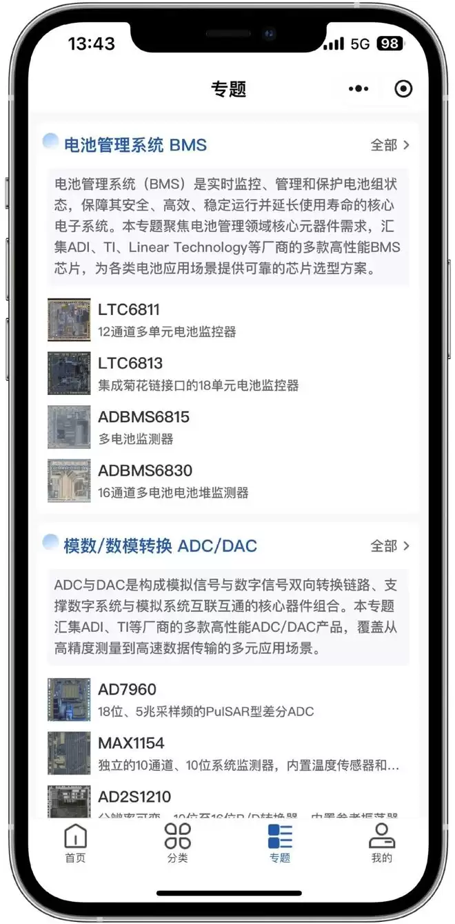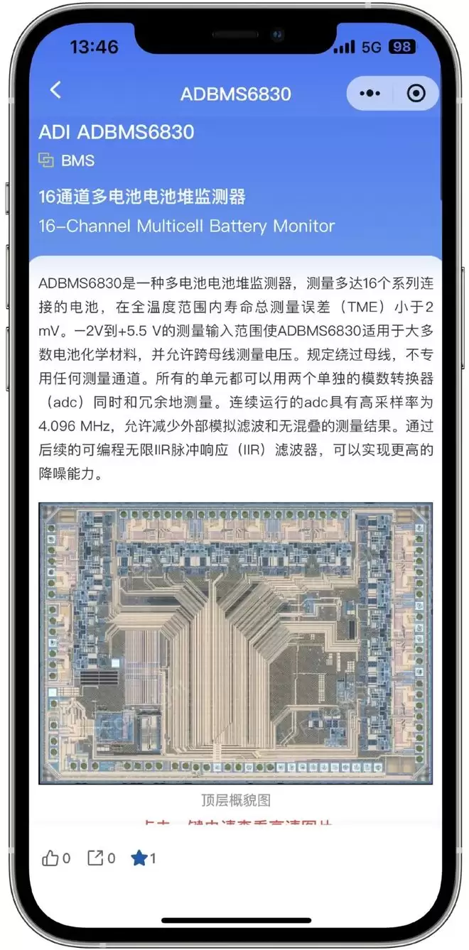 首页作为信息聚合的核心入口,最大化降低了用户的操作成本。您可以通过顶部的搜索栏,直接输入关键词查找感兴趣的专业分析报告,快速定位结果。以ADBMS6830为例,进入小程序后,通过搜索栏搜索ADBMS6830,可以进入ADBMS6830的详情页,查看顶层概览图、模块布局图、器件截图、典型层次化电路、重点模块高清图等信息。