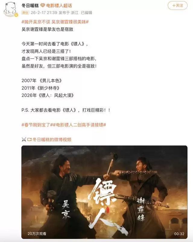 《镖人》路演有点回到了《封神第一部》和《流浪地球 2 》的感觉,每天线上线下都能激发出新的内容发酵点。吴京跳刀马、反串燕子娘、回应票房逆袭,吴京谢霆锋 “ 中年男人卖 CP” ( # 吴京 我的夫人姓谢 # ),于适、陈丽君展示功夫等,才艺多,会整活儿。