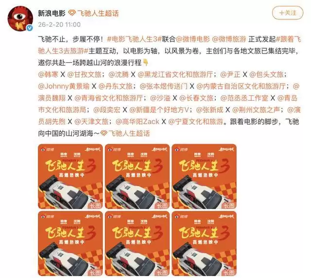 微博独家打造了从银幕到目的地的文旅联动样本,韩寒、沈腾、尹正、黄景瑜、张本煜、魏翔、沙溢、范丞丞等 13 位主创和各自家乡或影片拍摄地文旅最新共创,结合新春佳节安利各地美食美景,视频播放量超 142 万,阅读量破千万。主创们结合角色持续玩梗,在线回应网友 “ 王与王后、路书是情书、暗箱操作 ” 等热梗,衍生出 # 沙溢飞驰 3 犯的坏白展堂全责 # 、 # 飞驰人生 3 林臻东到底多有钱 # 等持续破圈。