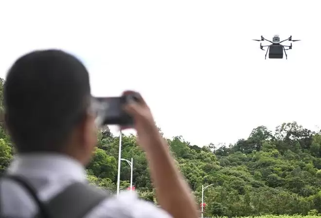 2025年6月26日,参观者在联合飞机集团深圳基地拍摄飞行中的物流无人机。