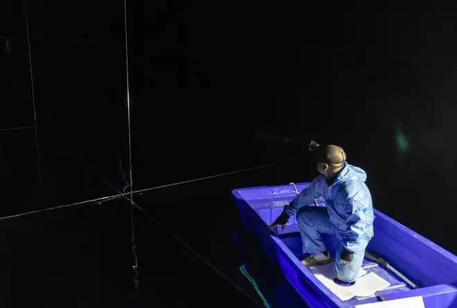 2024年4月21日,在位于四川省稻城县海子山的高海拔宇宙线观测站“拉索”水切伦科夫探测器阵列水池,科研人员坐船更换实验设备。
