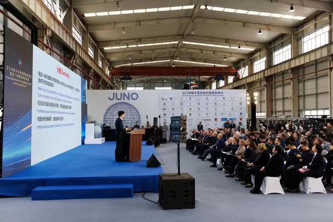 2025年11月19日,在广东省江门市举行的发布会上,中国科学院高能物理研究所副所长、江门中微子实验国际合作组物理分析负责人温良剑在报告首个物理成果。