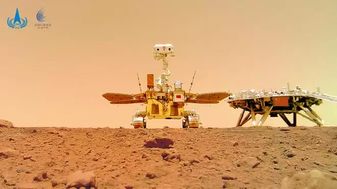 2024年6月11日,国家航天局在北京举行天问一号探测器着陆火星首批科学影像图揭幕仪式,公布了由祝融号火星车拍摄的着陆点全景、火星地形地貌、“中国印迹”和“着巡合影”等影像图。这是“着巡合影”图。