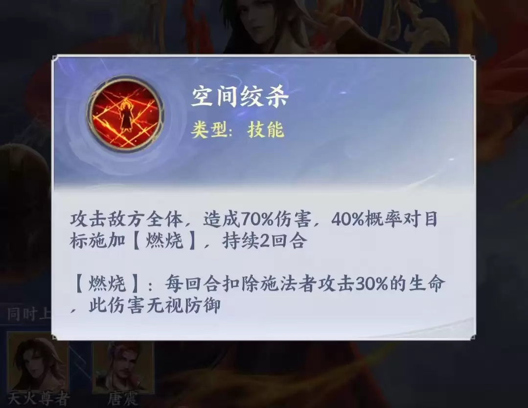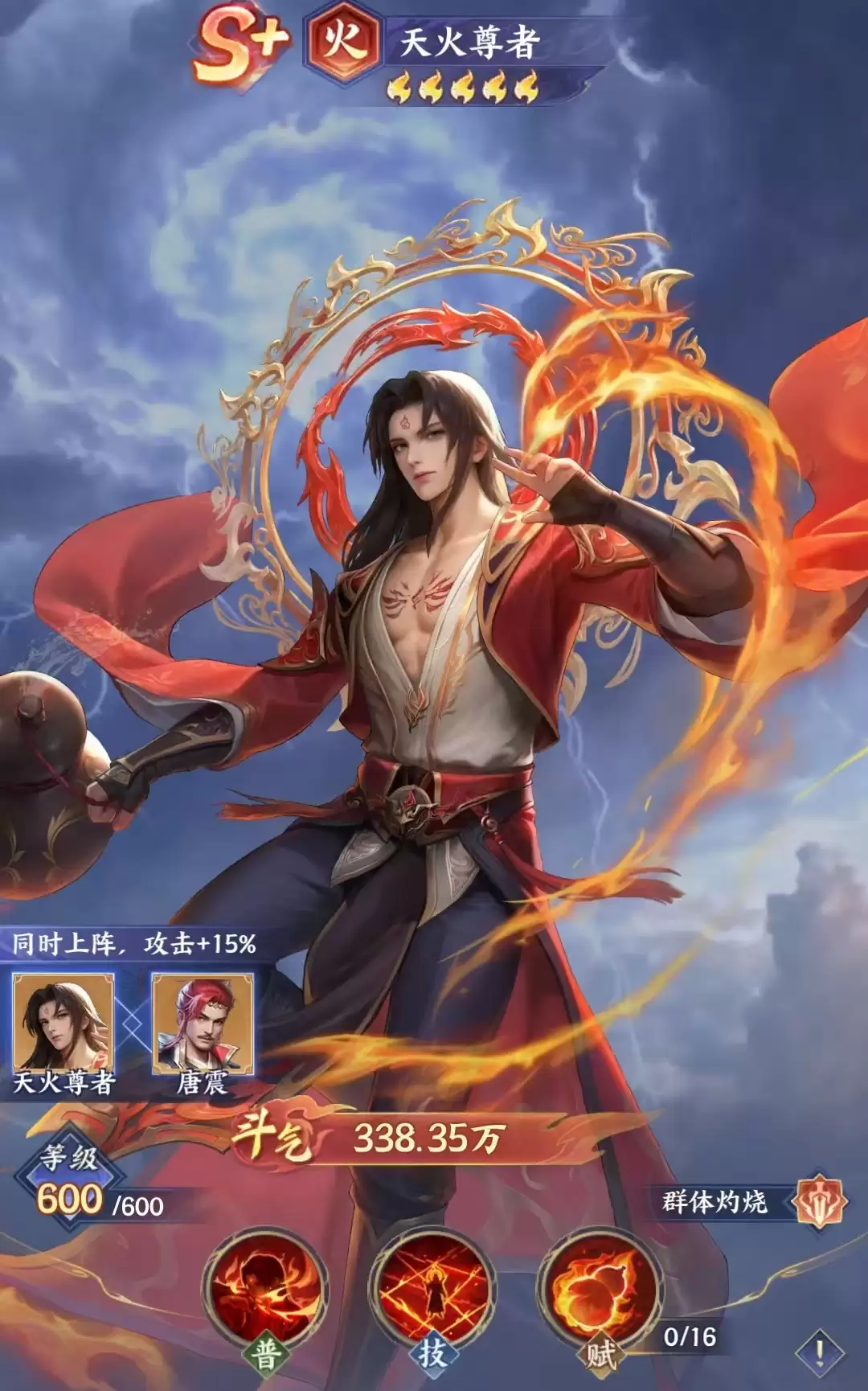 当角色达成白金一星后,天火尊者正式确立为灼烧流派战术核心。推荐的燃烧标准阵容为:天火尊者、唐震、邙天尺、风尊者、玄空子。其中唐震的全体技能可对燃烧目标触发眩晕,并有概率补充未燃单位;邙天尺的全体攻击附带重击判定,燃烧目标越多,重击触发率越高;风尊者则拥有燃烧扩散特效,可将单个目标的燃烧效果同步施加至周边敌人,形成连锁反应。