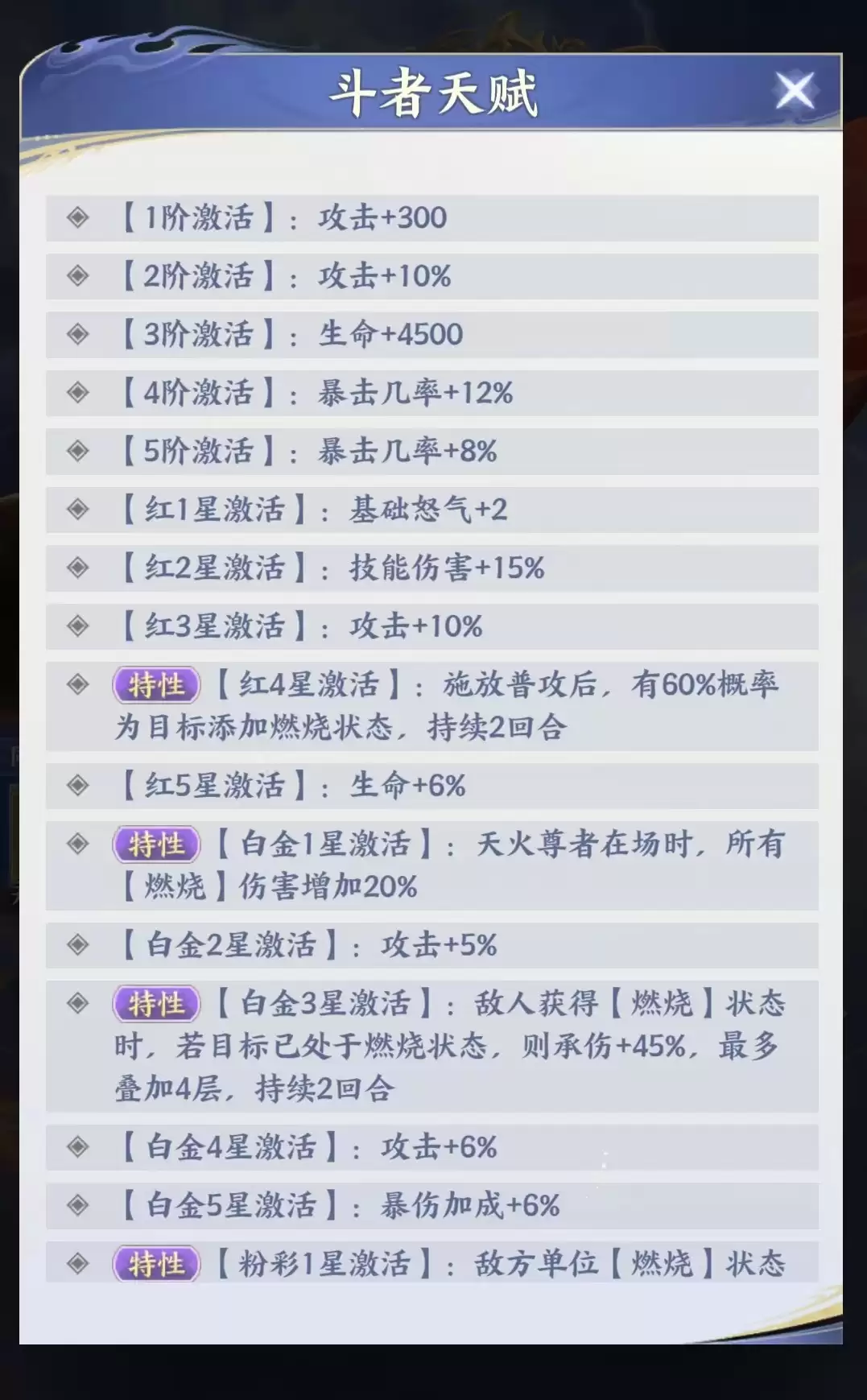 核心技能【空间绞杀】为全体攻击,除基础伤害外,附带概率施加“燃烧”状态,持续两个回合。该状态每回合造成相当于施法者30%攻击力的真实伤害(无视防御),构成了稳定的持续伤害链条。随着星级提升,其灼烧体系持续强化:升至四星时,普攻亦有概率附加燃烧;达到白金一星起,全队燃烧伤害提升20%;白金三星时,对已处于燃烧状态的目标追加额外伤害;粉彩一星则实现燃烧蔓延机制——当目标燃烧效果被清除或驱散时,会自动转移至相邻单位。