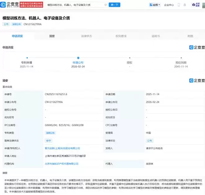 企查查APP信息显示,日前,智元创新(上海)科技股份有限公司公开申请了一项名为“模型训练方法、机器人、电子设备及介质”的专利。