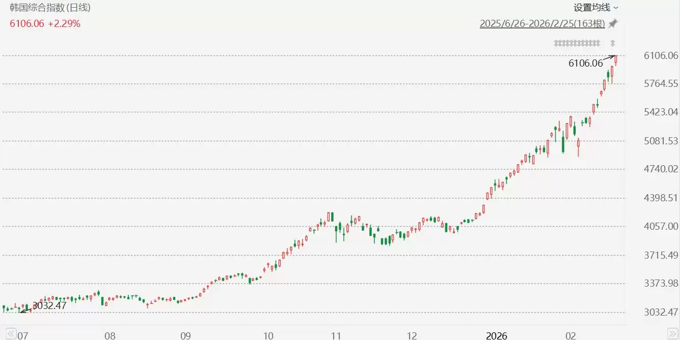 韩国综合指数今年1月22日刚刚站上5000点,仅用一个多月时间就累计攀升逾1000点。继2025年以75.63%涨幅领跑全球主要股市后,韩国综合指数2026年至今再度累计上涨45%,持续保持全球领先地位。