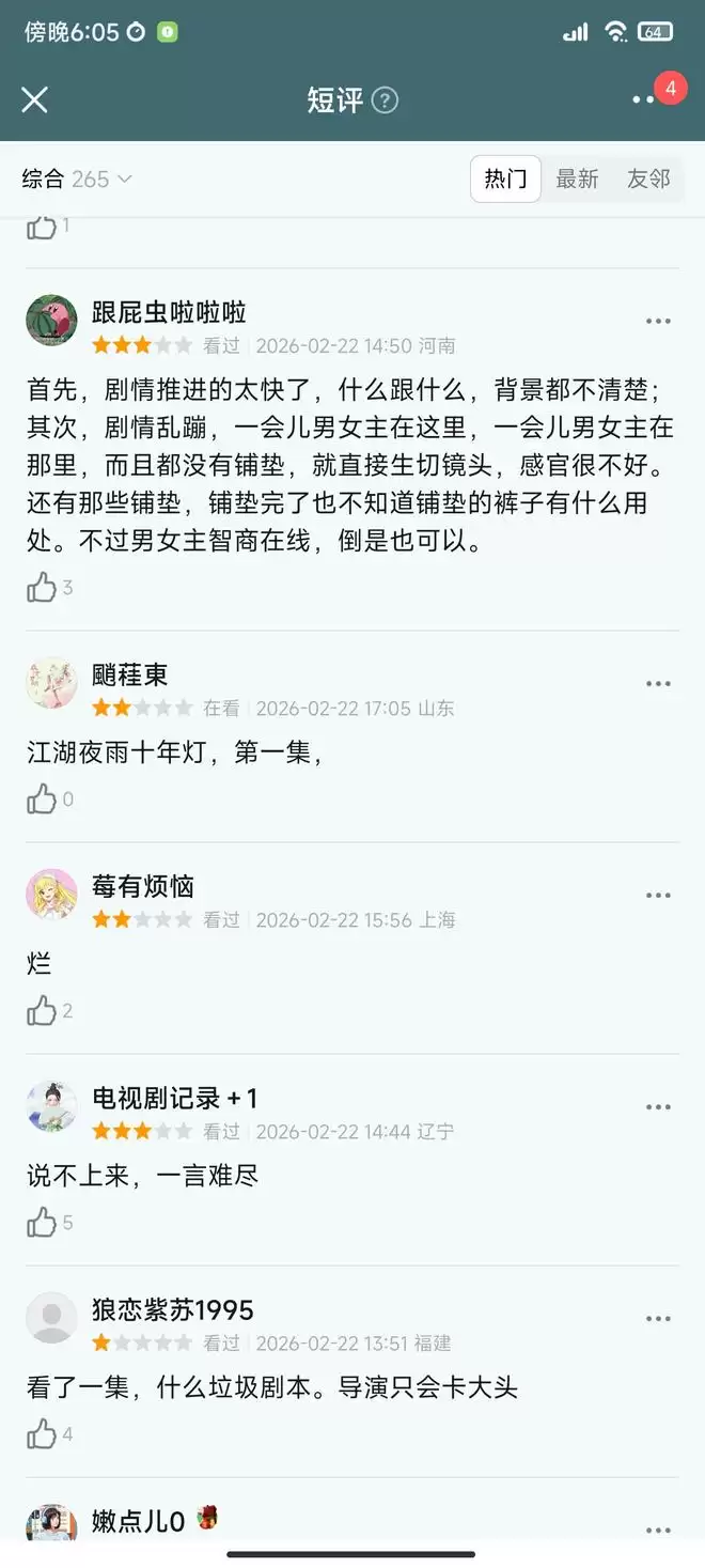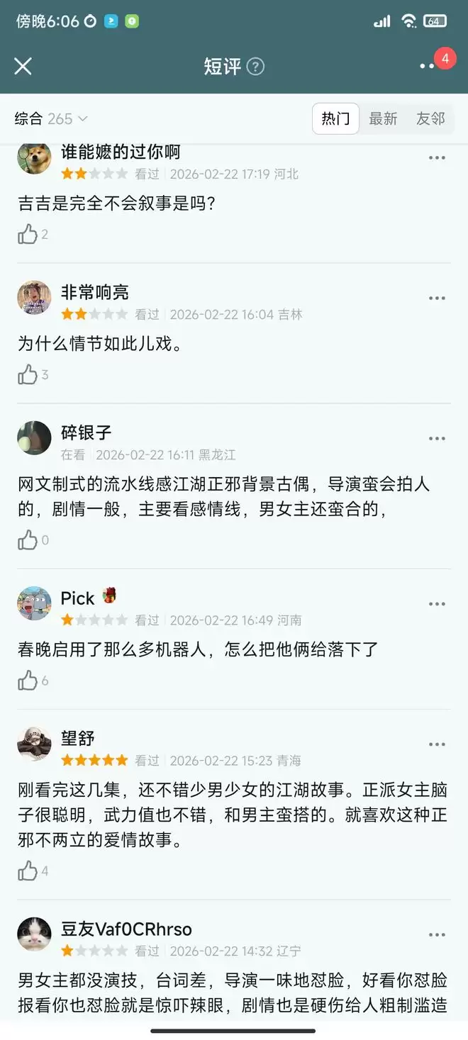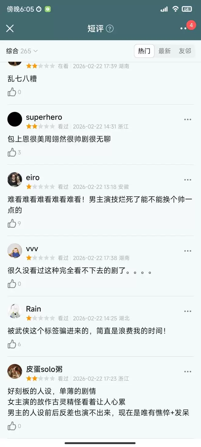 首播口碑也出来了,观众评价一针见血,就是无聊的剧情加上男女主机器人一样的演技简直是雪上加霜。武侠含量仅存在前期女主独白部分,背景和世界观交代不清楚,剧情节奏乱,直接生切镜头,一会儿男女主在这里,一会儿又在那里。感觉预告片就是诈骗,剧情一点张力没有,一直水时长,站桩对台词,没有有效剧情,小孩过家家一样,看得人昏昏欲睡。