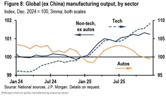 在对去年全球工业反弹的深度剖析中,摩根大通经济学家约瑟夫·鲁普顿和玛雅·克鲁克试图将其从美国贸易关税的扭曲和科技热潮中剥离出来。