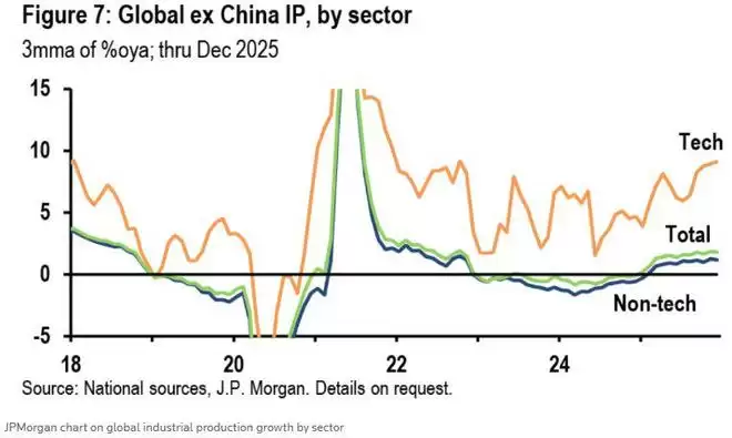 该行还补充道,资本支出预计将并行持续,同时非科技需求在 2026年将进一步扩大。摩根大通表示:“未来几个月,全球工业产出的年化增幅有望再达到 2%–3%。”