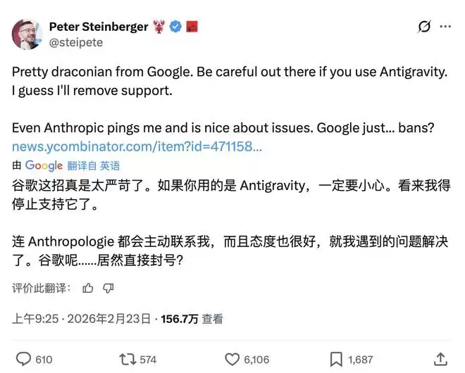 「谷歌这招真是太严苛了。如果你用的是 Antigravity,一定要小心。看来我得停止支持它了。 连 Anthropic(Claude)都会主动联系我,而且态度也很好,就我遇到的问题解决了。谷歌呢……居然直接封号?」