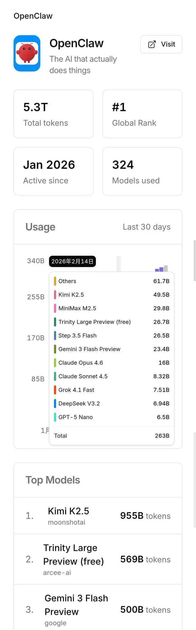 根据全球 AI 模型聚合平台 OpenRouter 的数据,现在 Kimi K2.5 已经是 OpenClaw 上调用量最大的模型。