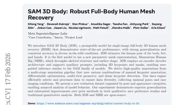 A:SAM 3D Body是Meta超级智能实验室开发的AI系统,能够仅从一张普通照片就重建出完整的三维人体模型。它不仅能重建身体的基本形状,还能精确捕捉手部和脚部的细致动作,甚至连手指的弯曲角度都能准确还原。这个系统还具备"可提示"特性,用户可以通过标记关键点来引导系统生成更准确的结果。