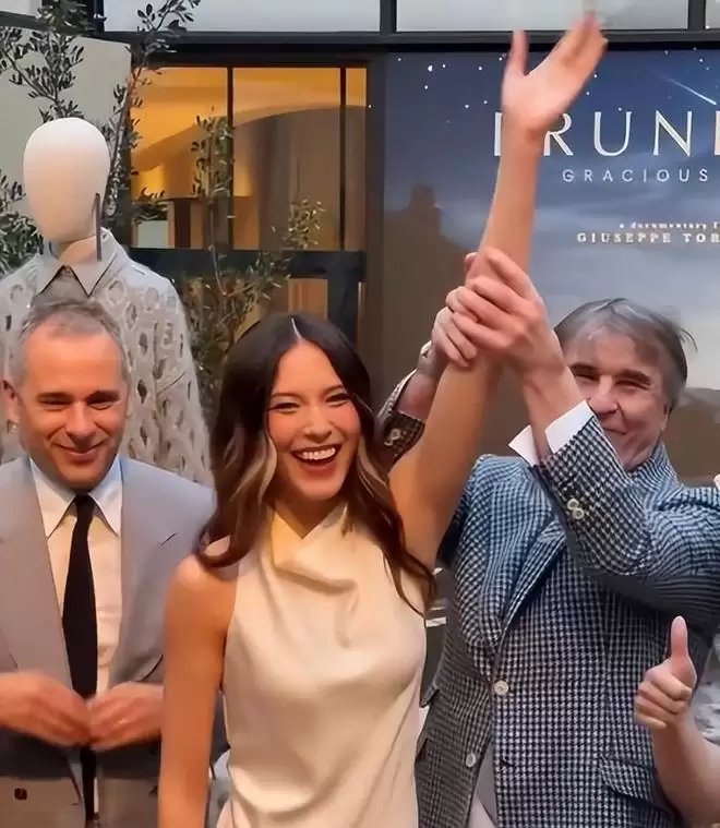 这样一个又优秀又能扛事的姑娘,自然走到哪都能收获好感,BC品牌的创始人布鲁内洛·库奇内利,也亲自出来接待她,看得出来对她格外重视。
