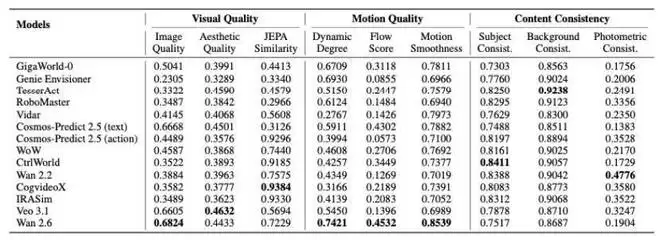 14 款世界模型在视频质量三大维度(视觉质量、运动质量、内容一致性)的各项指标评分表: