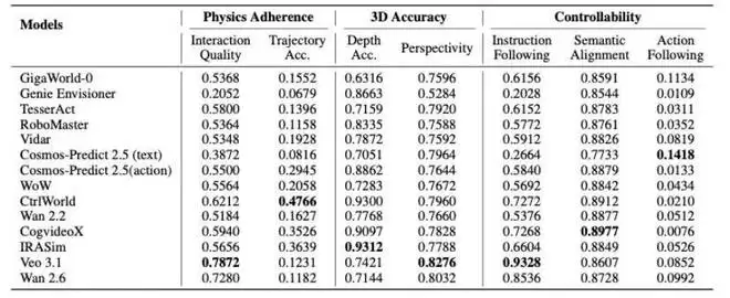 14 款世界模型物理贴合度、3D 准确性及可控性评分: