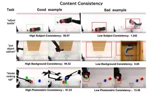 高分案例(90.07):在「adjust bottle」任务中,瓶子在机械臂交互全过程中保持形状、颜色、标识及位置的时序稳定,无漂移或形变,体现高保真「数字孪生」特性;低分案例(1.242):同场景下瓶子出现严重几何变形与身份特征丢失,产生视觉噪声,直接影响机器人策略训练的可靠性。