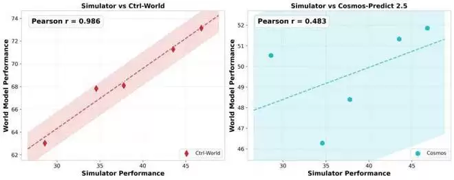 世界模型与物理模拟器的策略评估结果相关性: