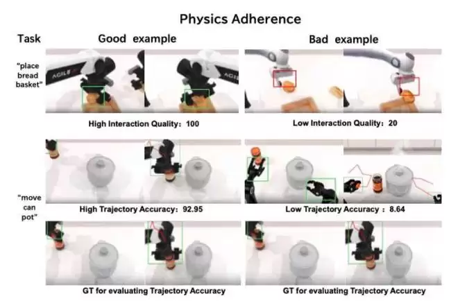 高分案例(92.95):在 「move can pot」任务中,机械臂运动轨迹(红色路径线)与真实物理轨迹(GT)高度吻合,动作精准连贯,符合物理运动规律;低分案例(8.64):同场景下轨迹出现显著偏离,伴随异常跳跃和不连贯动作,无法复现真实物理运动。