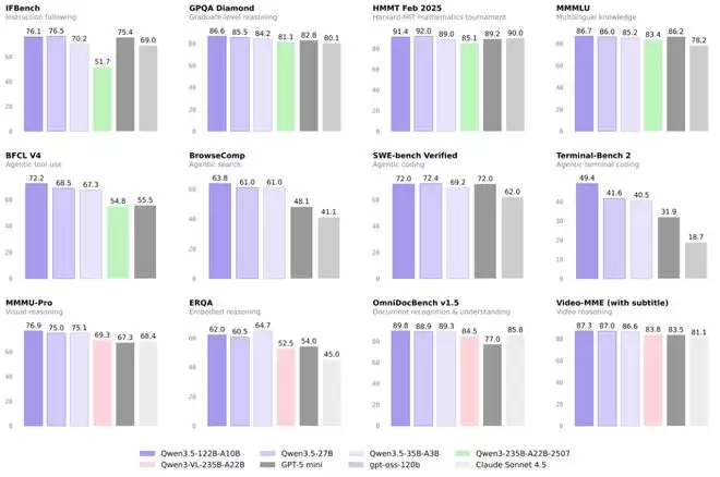 Qwen3.5-122B-A10B 与 Qwen3.5-35B-A3B,就是这一新范式在中等规模下的最新模型成果,在指令遵循(IFBench)、博士级别推理(GPQA)、数学推理(HMMT 25)、多语言知识(MMMLU)、Agent 工具调用(BFCL v4)、Agentic Coding(SWE-bench Verified)等多个权威榜单上,新模型均超越了远大于其规模的 Qwen3-235B-A22B 模型及 Qwen3-VL,以及 GPT-5 mini、gpt-oss-120b 等模型。