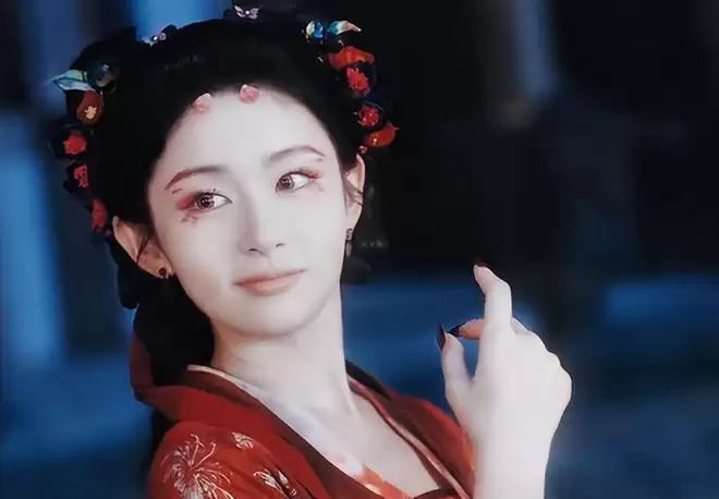 而这次的玉腰奴梁绛朱,是她首次挑战魅惑型的角色,一身红衣配简约银饰,侧坐石像时的抬眼瞬间,妖媚中带着一丝灵动,完全贴合剧中沈谬对她“既像野兽又像妖”的形容。