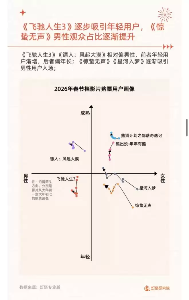 而后随着路演的逐步铺开,更多关于剧情解析、参演感受、幕后科普的内容出现,引导观众逐渐将关注重心聚焦到影片内容本身。据灯塔《2026年春节档电影市场洞察报告》显示,相比同档期其它影片,《惊蛰无声》的购票用户画像变化幅度较大,从档期开始时偏重年轻女性的粉丝群体,逐渐吸引男性、年长观众入场,向四象限的原点靠近。这表明,影片穿透明星效应,直抵路人盘的路径实现得较为成功。