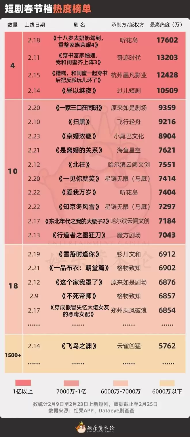 由于红果去年4月底热度值改版后,去年春节档短剧最高热度值有不同程度上调,小娱以去年春节档热度值X2的方式来对比今年同期。