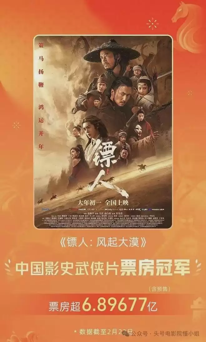 就在2月22日晚上,《镖人:风起大漠》票房突破6.9亿,正式成为中国影史武侠片票房冠军。