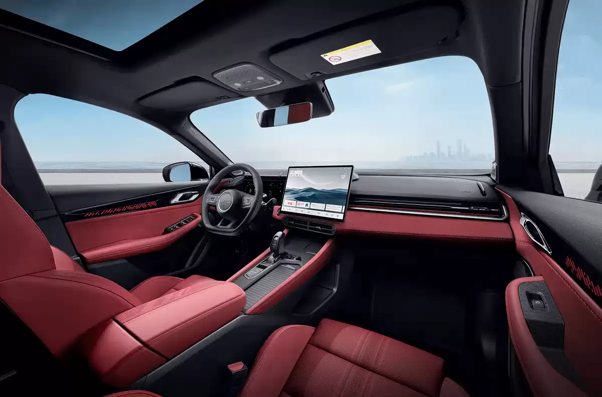 内饰设计上,新车采用了炽热红主题配色,营造出极具运动感的座舱氛围。官方描述称,这种红色如同赛道残影在车内流动,进一步强化了整车的运动基因。车内配置涵盖了三辐式平底运动方向盘、全液晶仪表盘以及中控多媒体大屏。此外,中控通道区域还配备了电子换挡杆,整体布局兼顾了科技感与实用性。