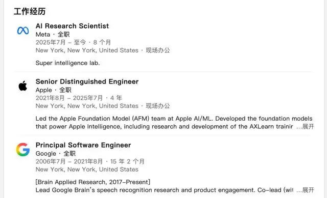 2024年,庞若鸣离开工作了15年的谷歌,来到了苹果,担任“高级杰出软件工程师”。