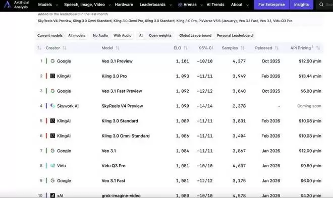 榜单地址:https://artificialanalysis.ai/video/leaderboard/text-to-video?audio-output=true&include-non-current=true