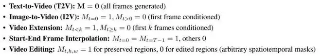 例如,如果掩码全为 0 ,意味着让模型从头生成视频,即文本到视频(T2V)任务 ;如果仅第一帧的掩码为 1 ,那就是让模型依据首帧向下续写,即图像到视频(I2V)任务。当然,也可以通过让前 k 帧的掩码为 1 来实现视频扩展,或让需要编辑的区域的掩码为 0 来实现视频编辑。