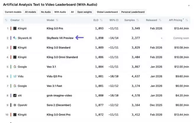 根据独立分析机构 Artificial Analysis 最新公布的标准化测试结果,SkyReels-V4 在文本生成视频 T2V(含音频)的现役模型榜单中取得全球第 2的成绩,并在全球历史所有 T2V 模型总榜中位列第 4。成绩超过了 Veo 3.1、Sora 2、Vidu Q3 以及 Wan 2.6 等当前主流模型。